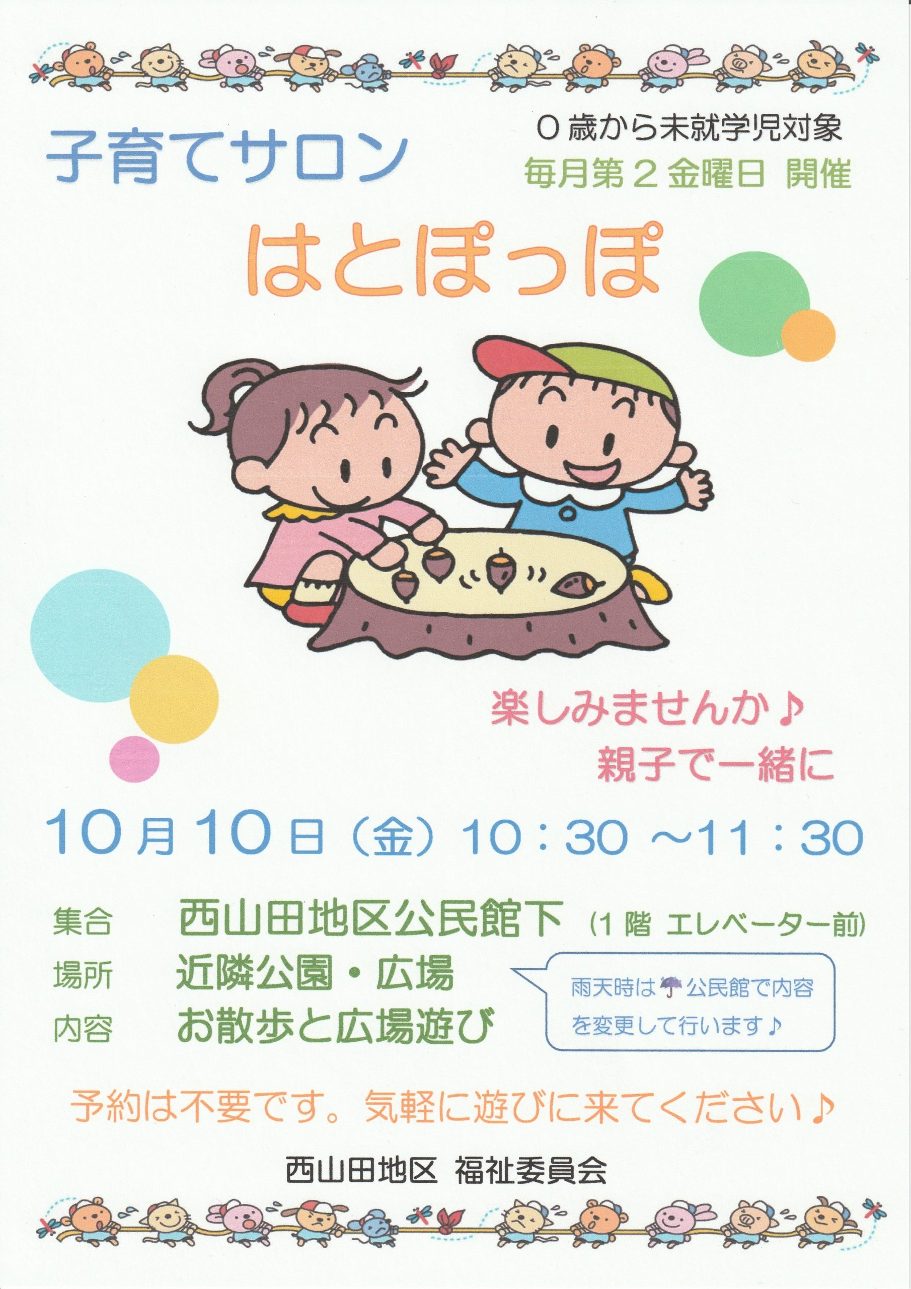 はとぽっぽ はとぽっぽ(子育てサロン) はとぽっぽ 2025.09.27 開催日: 2025年10月10日 10:30 AM - 11:30 AMカテゴリー: はとぽっぽ 集合:西山田地区公民館下(1階エレベーター前)場所:近隣公園・広場