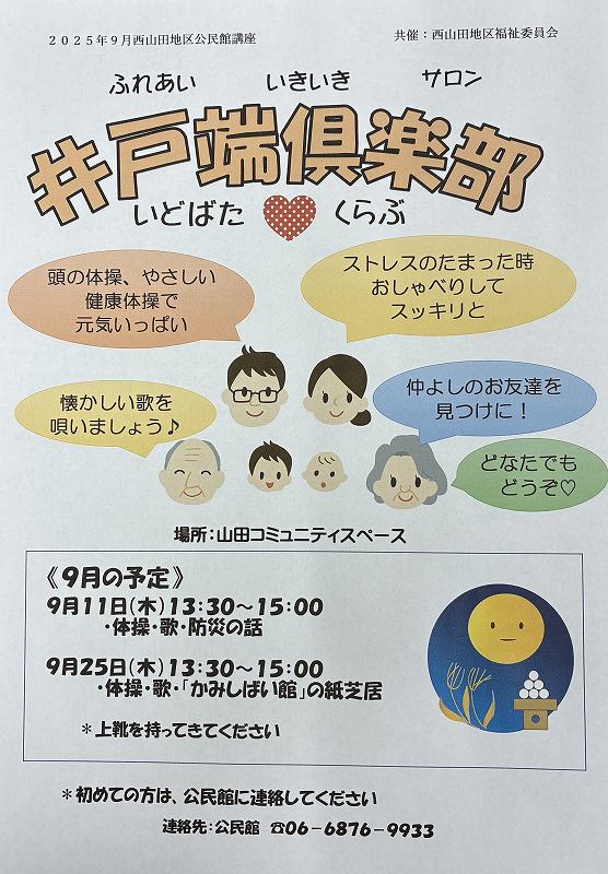 井戸端 井戸端俱楽部 井戸端 2025.08.22 開催日: 2025年9月11日 1:30 PM - 3:00 PMカテゴリー: 井戸端 於:山田コミュニティスペース (山田・千里丘地域備蓄倉庫敷地内)※上靴を持ってきてください。