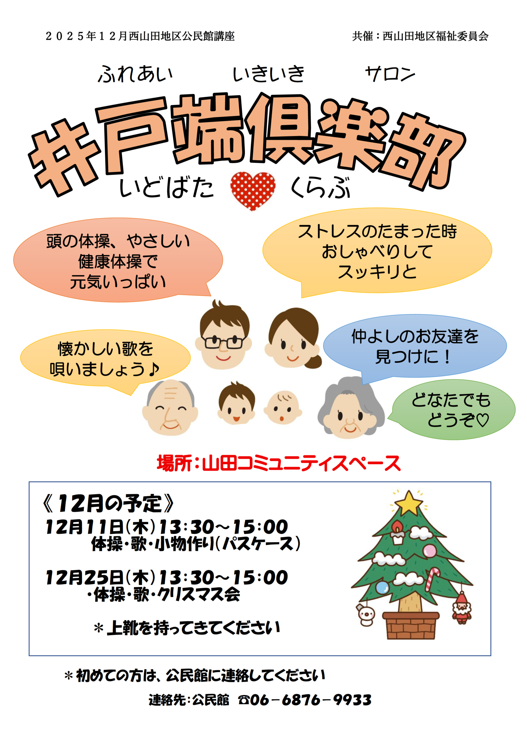井戸端 井戸端俱楽部 井戸端 2025.12.08 開催日: 2025年12月25日 1:30 PM - 3:00 PMカテゴリー: 井戸端 於:山田コミュニティスペース (山田・千里丘地域備蓄倉庫敷地内)※上靴を持ってきてください。