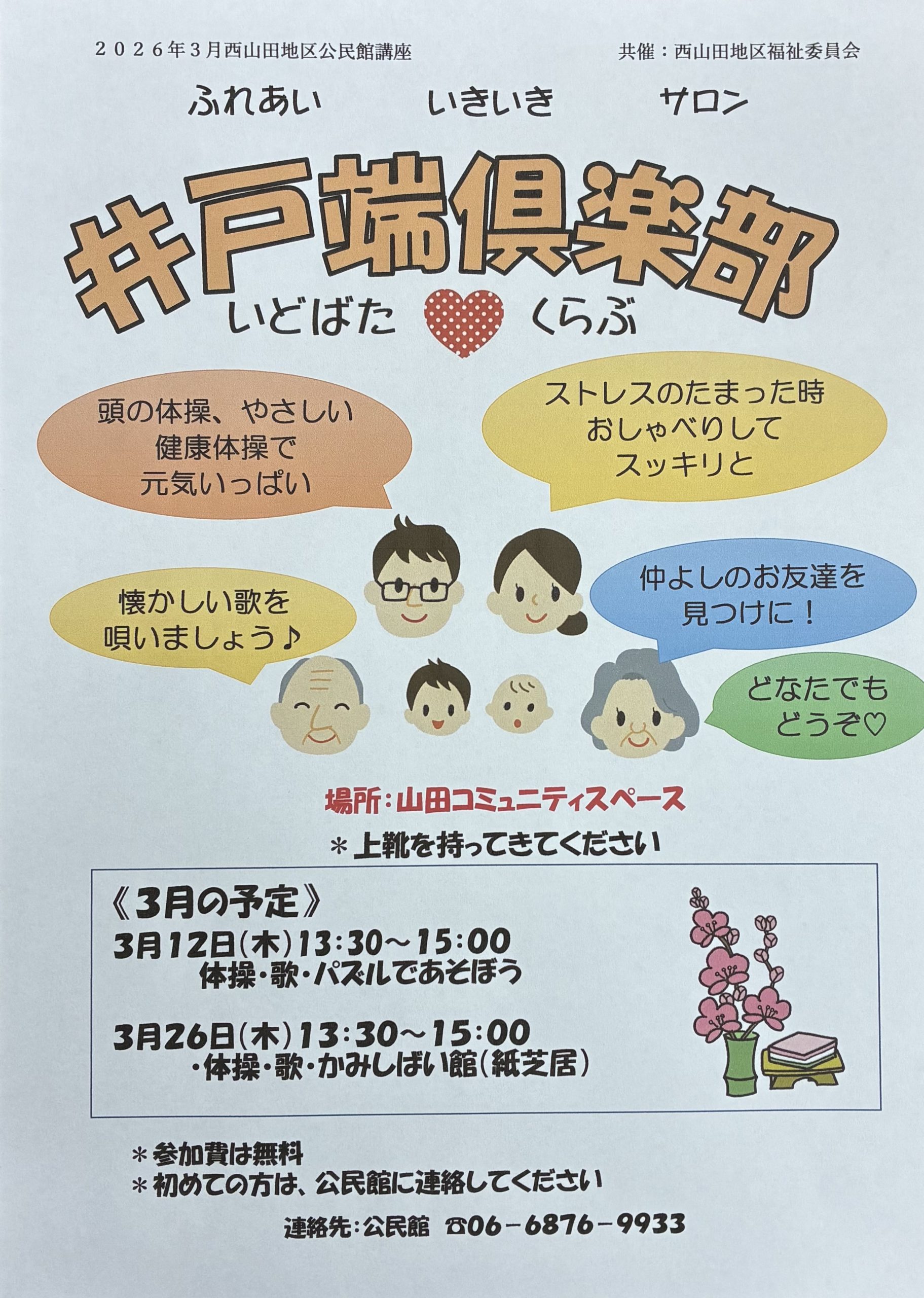 井戸端 井戸端倶楽部 井戸端 2026.02.28 開催日: 2026年3月26日 1:30 PM - 3:00 PMカテゴリー: 井戸端 於:山田コミュニティスペース (山田・千里丘地域備蓄倉庫敷地内)※上靴を持ってきてください。
